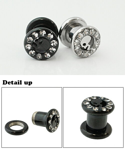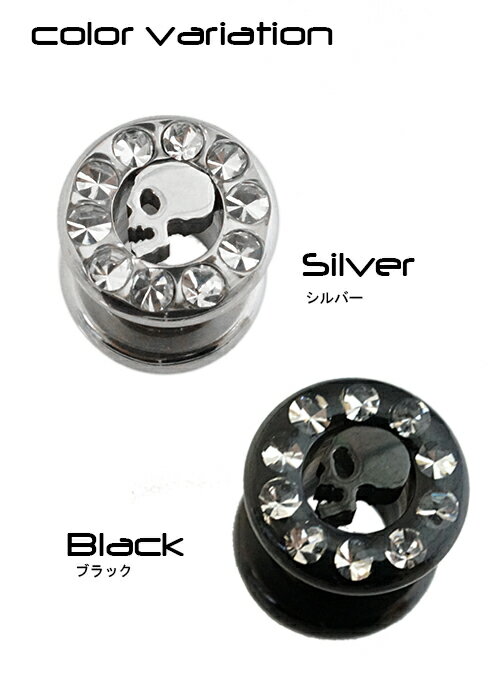 ギフト対応素材サージカルステンレス316lスワロフスキーサイズ太さ2G 直径6.5mm長さ6.5mm 外側 直径10.3mmスワロフスキーのサークルの中にドクロの模様を描いたフレッシュトンネルボディピアス 糸車のような形のボディピアスは人気の定番アイテムです 片側がねじ式になっているので、装着しやすく、実際つけているゲージよりも、ホールが大きくみえます。