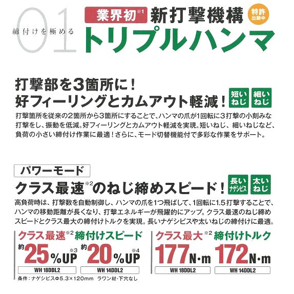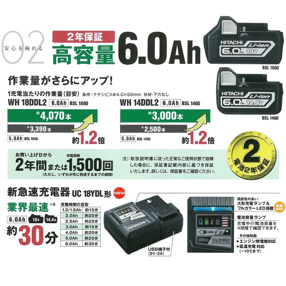 ・新発売 日立工機 14.4Vコードレスインパクトドライバセット ・超高容量 6.0Ah電池パック付属 お買い上げ日から2年間、または充電1,500回までのメーカー電池保障付き(*1) 5.0Ahと比較して作業量約1.2倍に(*2) 新型充電器で6.0Ahがハイスピード約30分充電に ・収納ケースがスタイリッシュかつ実用的なデザインに コンパクトなのに2.3Lの大容量小物入れ付きケース 様々な先端工具や使用頻度の高いネジを一気に収納 ・最大172N・mのハイパワートルク 締め付けスピード20%アップ、浮き上がり(カムアウト)も軽減(*2) ・他、防じん耐水やブラシレスモータ、LEDライト、電池残量表示など基本機能も搭載 【付属品(セットと本体のみにより異なります)】 セット:本体/BSL1460バッテリx2/UC18YDL充電器/ケース/ビット 本体のみ:本体/ ・送料80サイズ *1 保証書記載内容に基づく場合 詳細は保証書をご確認下さい *2 共にメーカー比較
